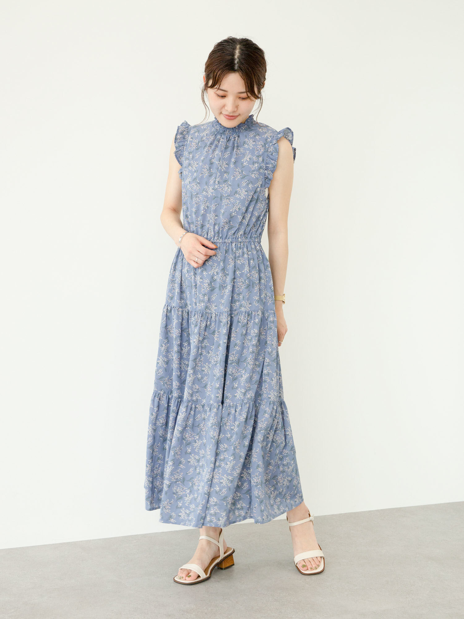 ワンピース ミディアム丈 フレア 花柄 シャーリング 半袖 青 ワンピース Buyma